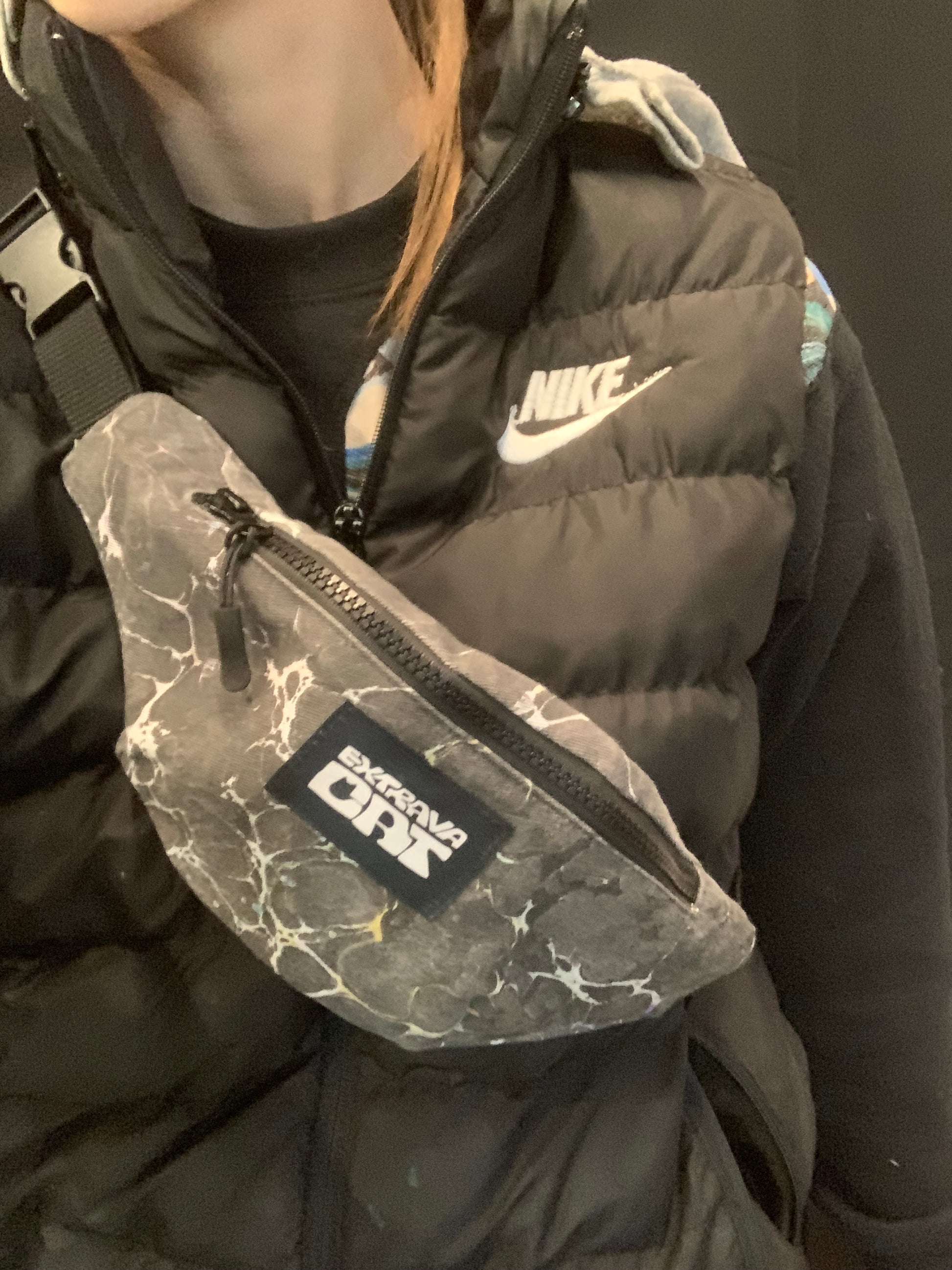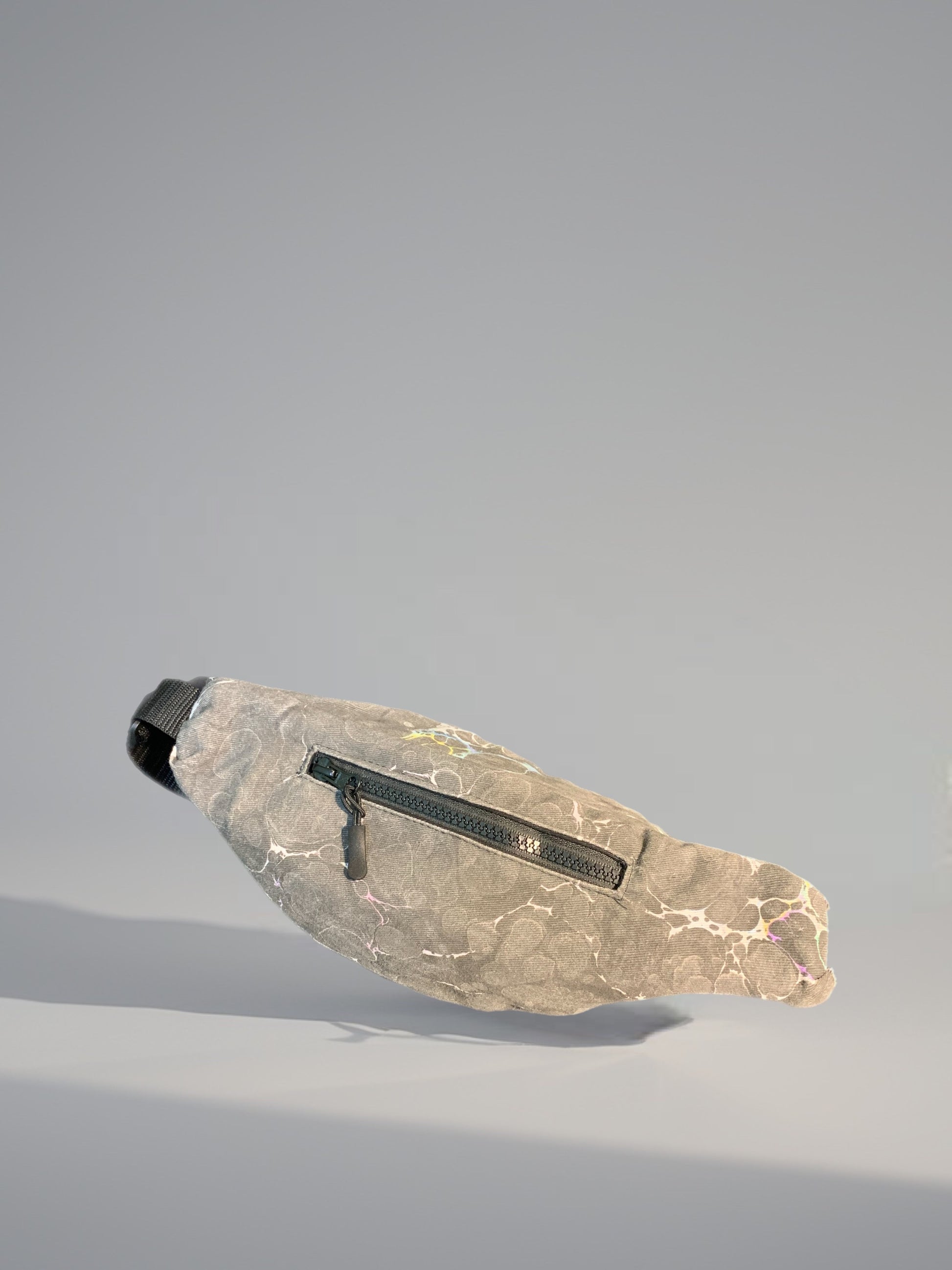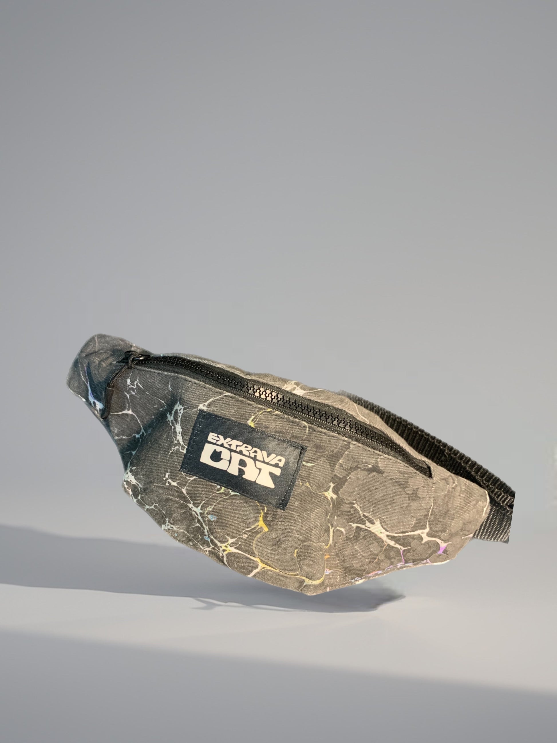 Cucito interamente a mano è fatto in 100% cotone decorato con la tecnica del marbling.