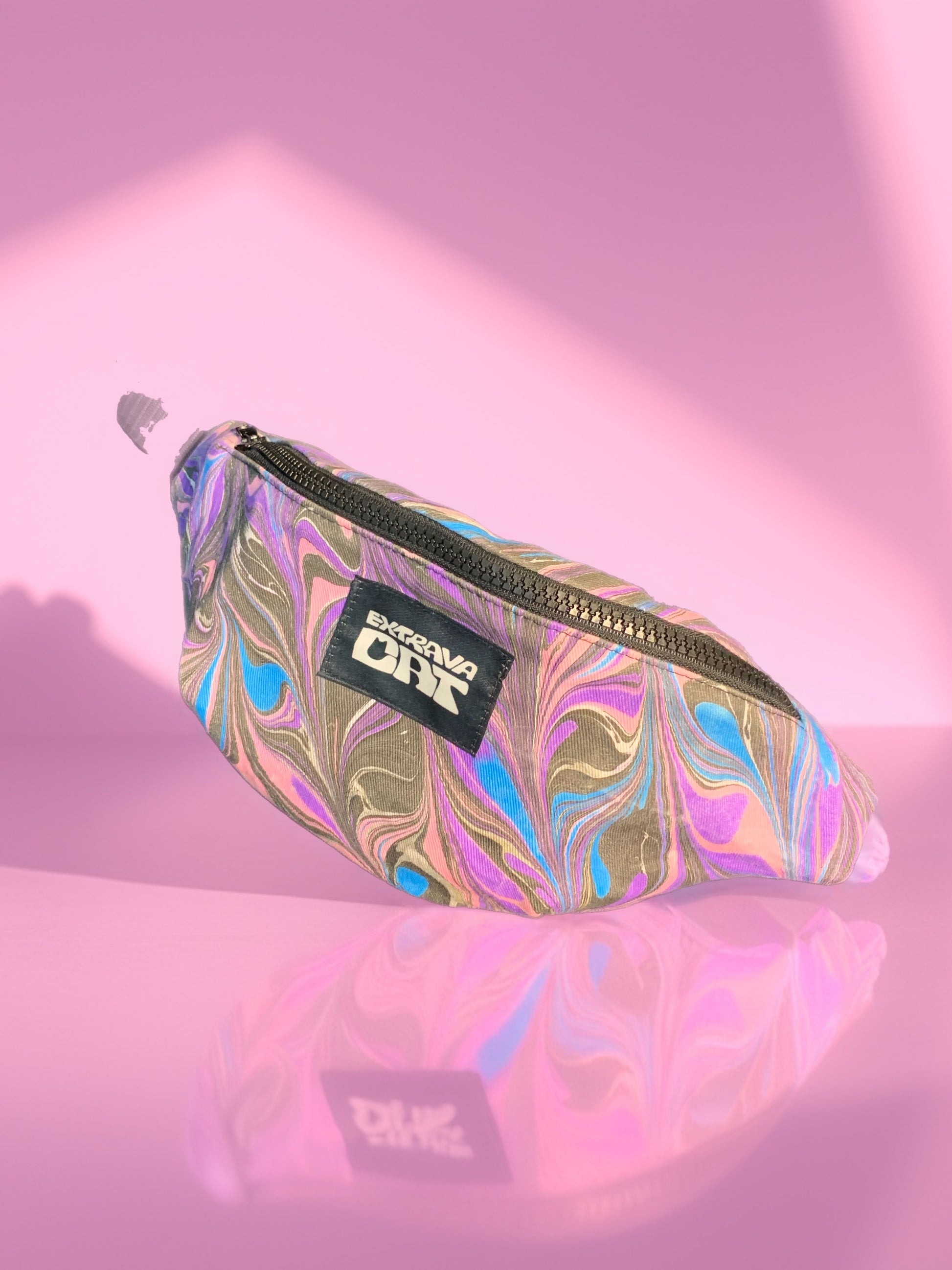 Cucito interamente a mano è fatto in 100% cotone decorato con la tecnica del marbling.